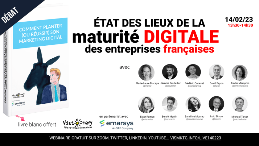 Où en est réellement la maturité digitale des entreprises françaises ? Visionary Marketing a réalisé en 2022, en partenariat avec Emarsys, filiale de SAP, un dossier composé de sept billets (et podcasts) intitulés comment planter (ou réussir) son marketing digitalDéfinition marketing digital, un terme utilisé en permanence et pourtant bien mal compris car mal défini. Nous avons ensuite réuni ces articles dans un eBook. La richesse des témoignages des professionnels du marketing recueillis pour la réalisation de ces articles nous a donné envie, pour appuyer la visibilité de cet eBook, d’organiser un débat sur la maturité digitale des entreprises françaises en 2023. Pour cela nous avons réuni un panel de professionnels du digital et de la transformation des entreprises afin de débattre de ce sujet sur LinkedIn et les médias sociaux le 14 février 2023.