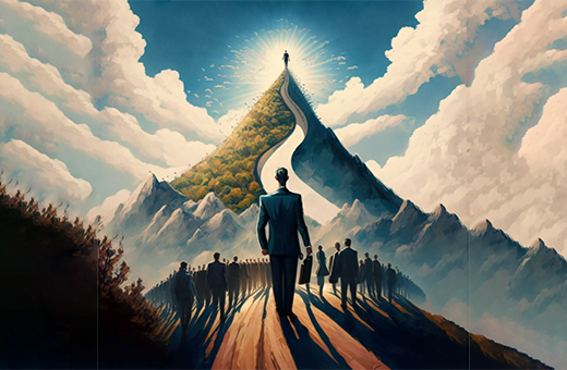 *Image produite avec Midjourney sur notre compte avec le prompt suivant : A benevolent kind and inspiring leader is showing the way to Heaven to a group of employees (men and women) wearing suits who are smiling and climbing a mountain with trees on the side, blue sky, rising sun in the background. Long and winding dirt road a few light clouds. L’image a été complétée par l’IA Adobe Sensei de Photoshop.