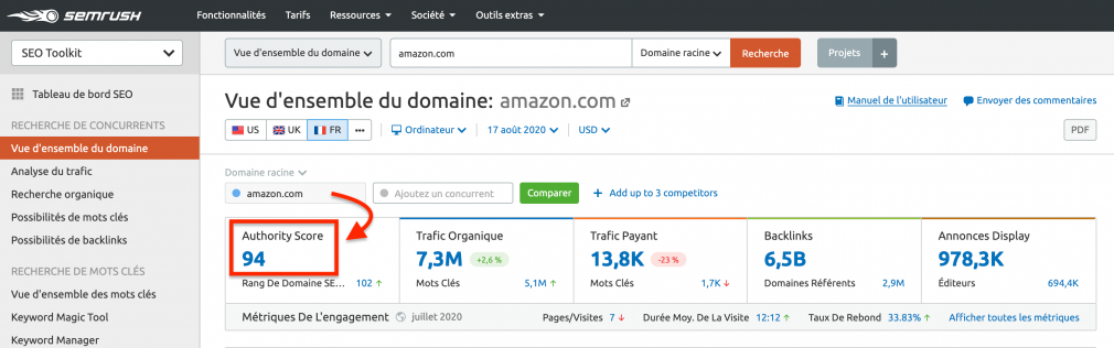 L’Authority Score de Semrush est une métrique utilisée pour mesurer la qualité globale et les performances SEO d’un domaine ou d’une page Web. Le score est basé sur de nombreuses mesures évaluant la fiabilité et l’autorité ; il utilise un réseau neuronal et l’apprentissage automatique pour s’assurer que le score est toujours précis et fiable.