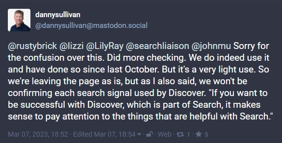Ce 7 mars, Danny Sullivan a fait son mea culpa. Après avoir affirmé que la documentation était incorrecte, il est finalement revenu sur ses paroles sur Mastodon, où il a écrit :