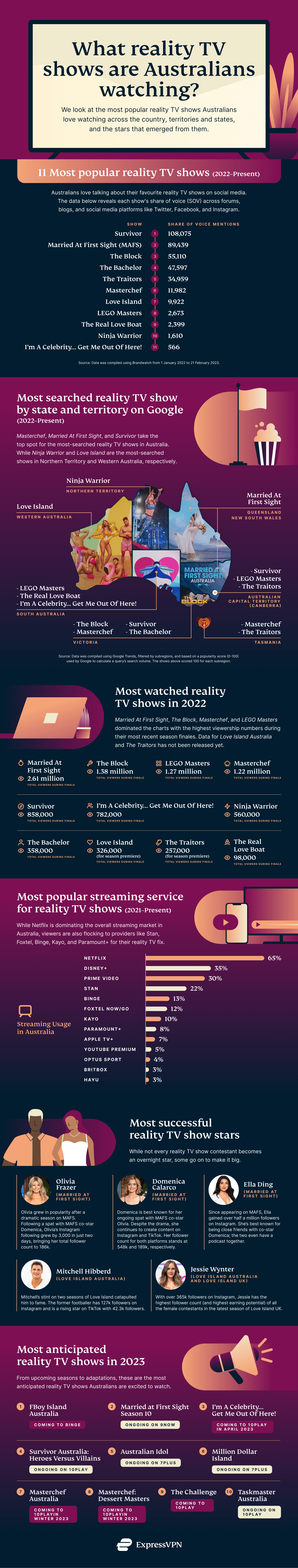 Le paysage australien de la télé-réalité est aussi diversifié et complexe que le pays lui-même. Depuis L’île de l’amour pour Le bloc et guerrier ninja, les émissions que les Australiens adorent regarder reflètent l’amour du pays pour le bricolage, la nourriture et le théâtre. Et, avec une gamme d’options aussi diversifiée, il n’est pas surprenant que les Australiens de tous les États et territoires soient devenus de fervents fans de télé-réalité.