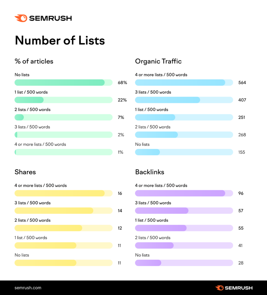Performance des articles en fonction du nombre de listes – Source : Semrush
