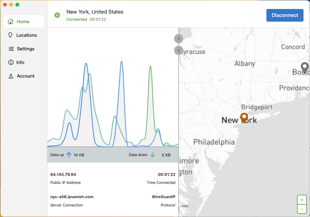 Le nouveau design de notre logiciel Mac est maintenant en accord avec les autres applications IPVanish que nous avons mis à jour et amélioré sur tout au long de 2022. Cette mise à jour de l’interface facilite la navigation dans les différents paramètres et options, afin que vous puissiez personnaliser votre expérience VPN à votre guise. Nous avons également facilité la connexion et la sélection de nouveaux emplacements via la carte sur l’écran d’accueil.