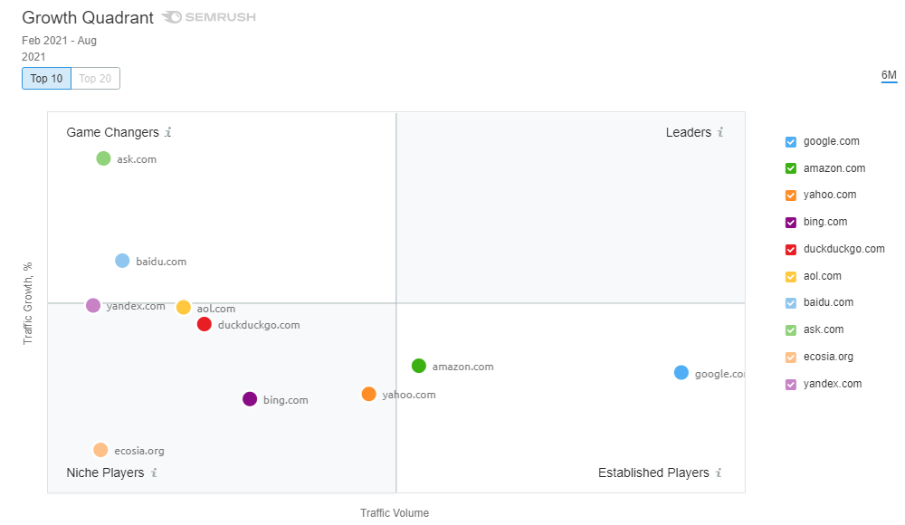 Google et Amazon sont considérés comme des « acteurs en place », ce qui ne nous étonne guère si l’on considère la place qu’ils occupent dans le tableau des parts de visites. Ask.com et Baidu, quant à eux, apparaissent comme des « acteurs qui changent la donne », dans la mesure où ce sont eux qui ont connu la plus forte croissance au cours des six derniers mois. En revanche, les « acteurs de niche », tels qu’Ecosia, commencent tout juste à trouver leur place – il est donc difficile de prévoir ce qu’il adviendra d’eux.
