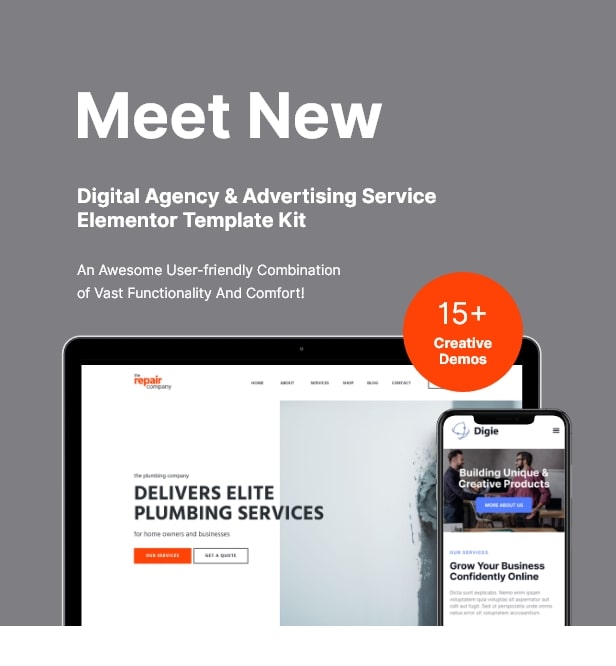 Renovirta est un kit de modèles de construction et de rénovation lumineux et coloré pour Elementor. Les modèles ont un design professionnel et tendance dédié à tout type de bureau d’affaires de maintenance et de réparation. Le kit sera intéressant pour une entreprise de rénovation, une entreprise de plomberie ou des entreprises de toiture qui cherchent à présenter leurs services ou à établir une boutique/un magasin (en raison de la compatibilité du kit avec WooCommerce).