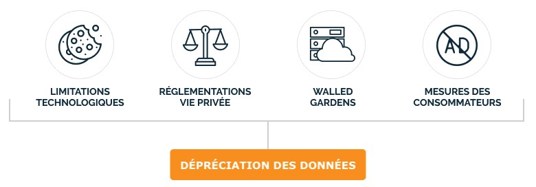 Il y a encore quelques années, les données étaient accessibles en quantités quasi illimitées pour les entreprises. Celles-ci étaient souvent utilisées sans réel respect de la confidentialité des utilisateurs. Actuellement, ces données existent toujours et sont donc exploitables par les entreprises, mais il existe de plus en plus de freins, techniques ou légaux. L’écosystème digital a évolué depuis, et leur exploitation n’est plus recommandée, c’est pour cela que nous pouvons parler de dépréciation : même si les données existent toujours, leur utilisation devient complexe, voire impossible. Qualifio a identifié quatre facteurs clés dans ce changement de paradigme :