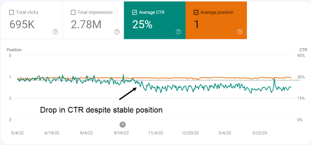 Exemple de positionnement stable mais de baisse du CTR. Source : Is your organic traffic eroding ?