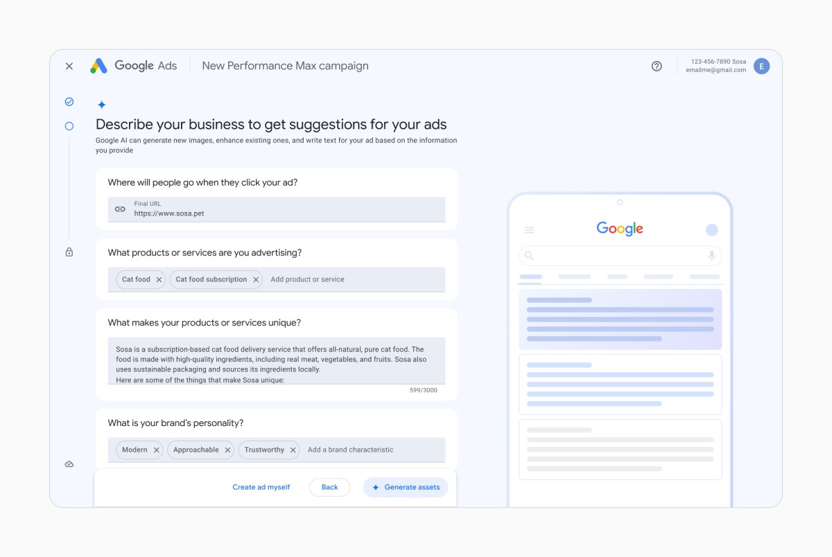 La fonctionnalité Automatically Created Assets (composants créés automatiquement en français), qui était en version bêta, sera désormais elle aussi boostée par l’IA générative. Cela permettra des mises à jour automatiques du contenu publicitaire pour faciliter et rendre la création de campagnes plus pertinente.