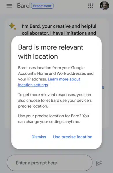 Google Bard est désormais capable d’utiliser l’emplacement précis d’un appareil afin de proposer des réponses plus pertinentes pour les requêtes locales. Lorsque cela est possible, Google affiche une fenêtre pop-up qui propose d’activer (ou non) la fonctionnalité. Par ailleurs, il est possible que le service demande à l’utilisateur s’il souhaite partager sa position avec Google. Selon les premiers tests effectués par Search Engine Land, la fonctionnalité ne semble toutefois pas encore active.