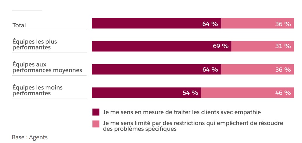 Le rapport démontre que la compréhension des problématiques des clients est essentielle pour obtenir de bonnes performances. En effet, au sein des équipes les moins performantes, 46 % des agents estiment manquer de contexte sur la situation du client. Ce chiffre tombe à 27 % pour les équipes les plus performantes. De même, les agents qui font preuve d’une plus grande empathie envers leurs clients sont davantage en mesure d’obtenir des résultats positifs.