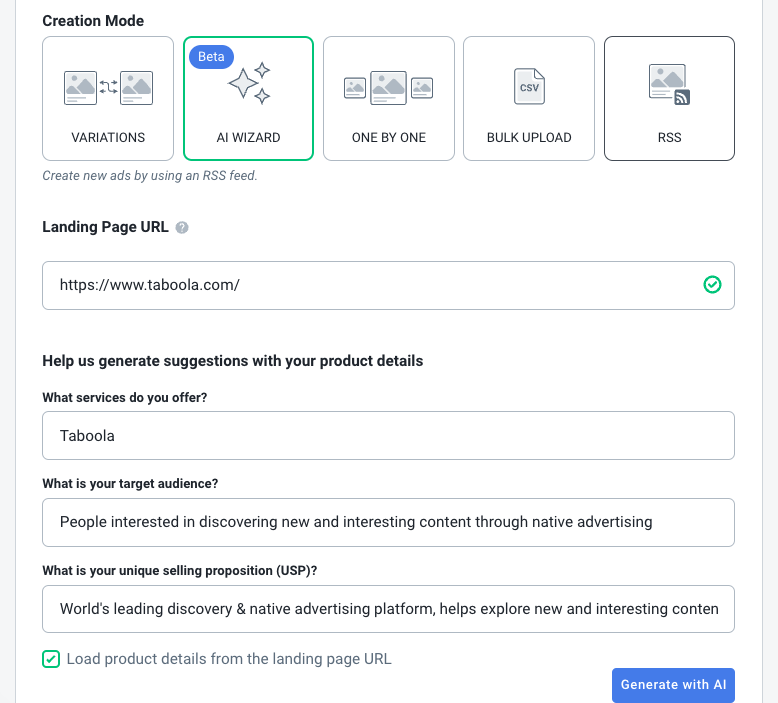 • Contenu de haute qualité. Les publicités sont créées sur la base des données de dizaines de milliards d’engagements sur le réseau de Taboola. Cela signifie que l’outil d’IA peut suggérer des créations qui sont déjà conformes à nos meilleures pratiques et qui sont les plus susceptibles de générer des conversions. Notre politique de contenu est également intégrée à nos modèles d’IA, de sorte que les annonces sont plus susceptibles de répondre aux exigences CRT de Taboola et d’être approuvées rapidement.