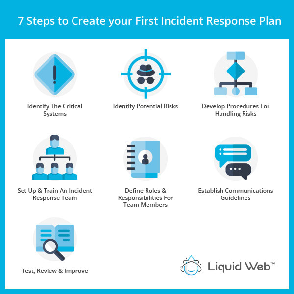 Les 7 étapes pour créer votre premier plan de réponse aux incidents consistent à identifier les systèmes critiques, identifier les risques, développer des procédures de gestion des risques, mettre en place et former une équipe IR, définir les rôles et les responsabilités de l'équipe IR, établir des directives de communication et tester, réviser et améliorer le plan.