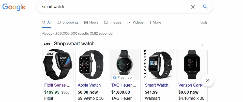 • Let’s say a user is searching for a smartwatch on Google. This is how the Google SERP page shows the results: