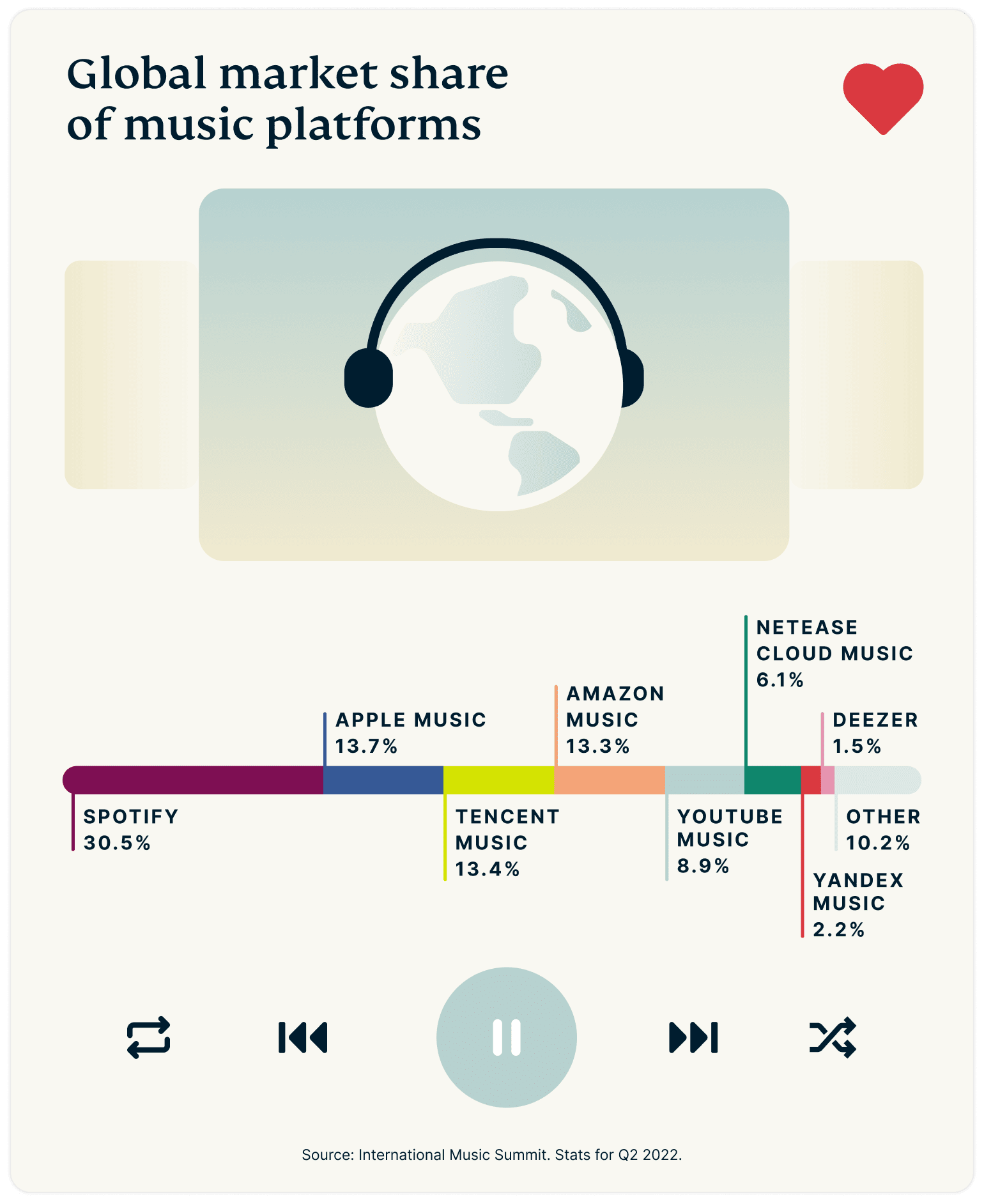 According to an industry report by the International Music Summit, Spotify is the reigning king of the music streaming world. As of 2022, Spotify’s subscriber base accounted for almost 31% of the worldwide market share—a number that’s expected to have surged even higher by the end of 2023. This is followed by Apple Music, boasting a 13.7% share, and Tencent Music, with 13.4%.