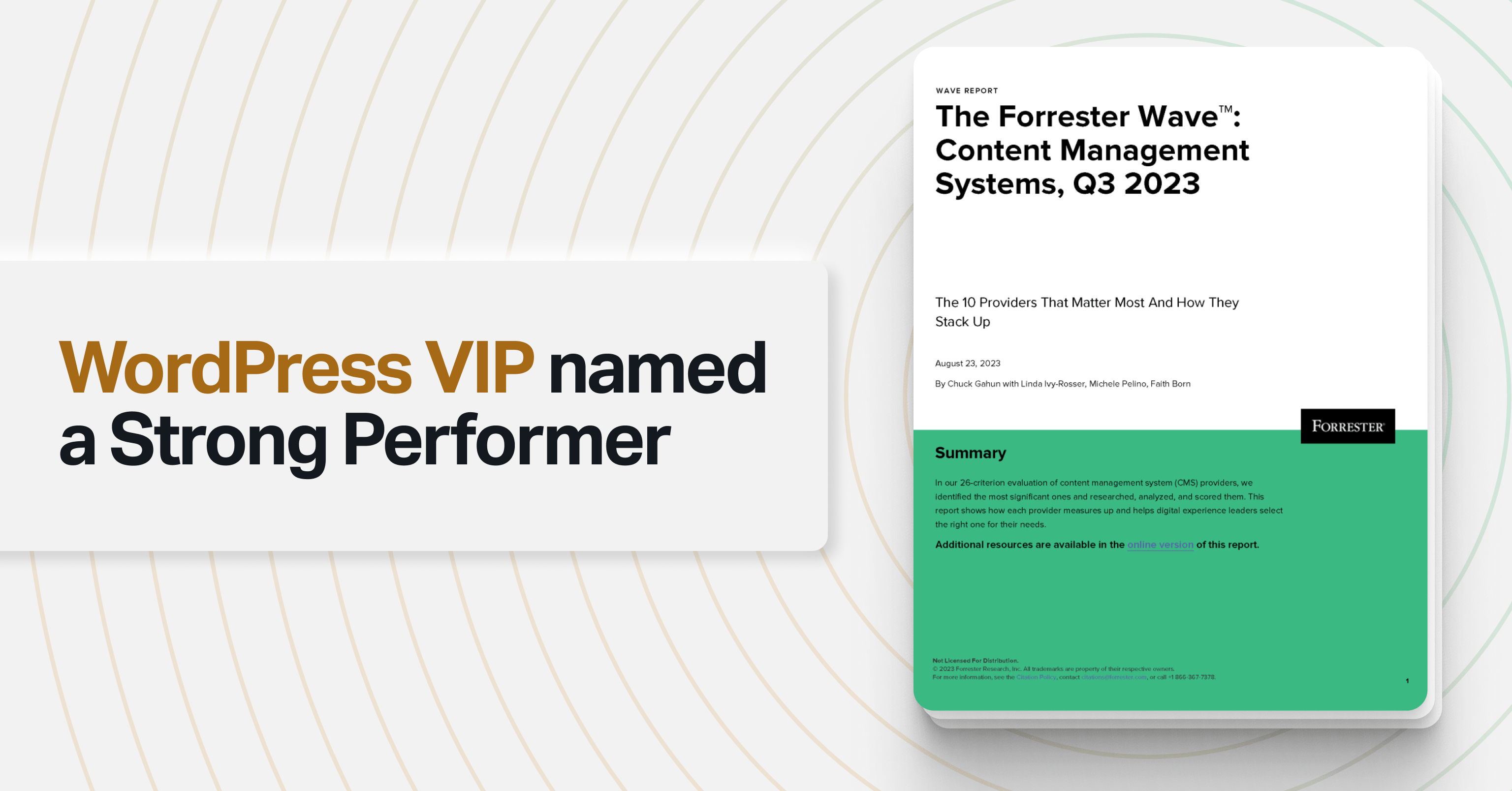 In the end, Forrester named WordPress VIP a strong performer. In fact, WordPress VIP received the third highest score in the current offering category and received the highest scores possible in six criteria including: “content generation and findability,” “content lifecycle and compliance,” and “low-/no-code and experience assembly.”