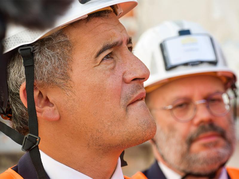 Après une première halte à Marseille en début de matinée pour inaugurer le nouveau bâtiment du Raid et évoquer notamment une cité phocéenne «enkystée dans le trafic de drogue», le ministre de l’Intérieur et des Outre-Mer a effectué une visite de chantier express du futur hôtel des polices de Nice. Débutés en janvier 2023, les travaux, qui comprennent une phase de déconstruction puis de reconstruction et enfin d’aménagement, sont censés durer jusqu’en 2025. Avec un coût global de 239M€ TTC, hors foncier, dont 172M€ sont financés par l’Etat “au prorata des surfaces occupées, dans le cadre de la LOPMI” (Loi d’orientation et de programmation du ministère de l’intérieur), le bâtiment de 50.000m², décrit comme “connecté, sécurisé et respectueux de l’environnement“, réunira les services de la Police Nationale, de la Police Municipale ainsi que de l’Agence métropolitaine de sécurité sanitaire, environnementale et de gestions des risques (AMSSEGR).