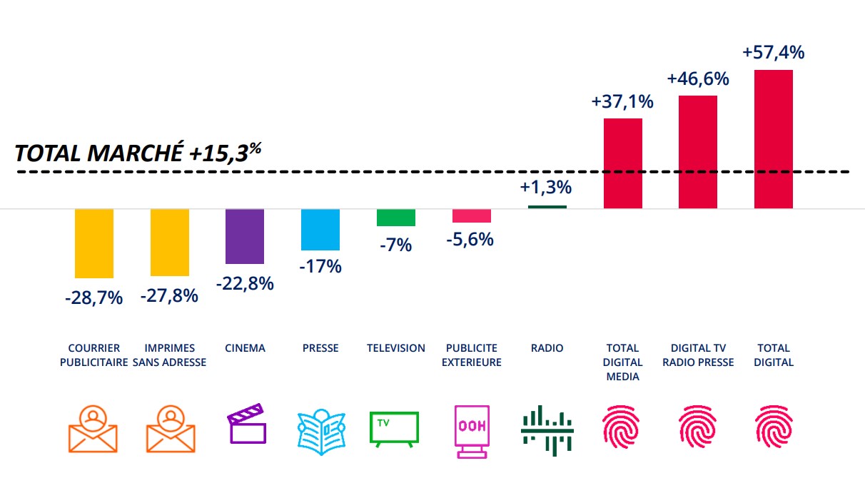 L’évolution du digital média sur 4 ans est encore plus marquée : +46,6 % de recettes publicitaires par rapport au S1 2019. A contrario, la plupart des publicités au format traditionnel ont connu des baisses de recette conséquentes sur cette même période : -28,7 % pour le courrier publicitaire, -22,8 % pour le cinéma (qui a toutefois connu une hausse de 20,9 % cette dernière année), -17 % pour la presse, -7 % pour la télévision.