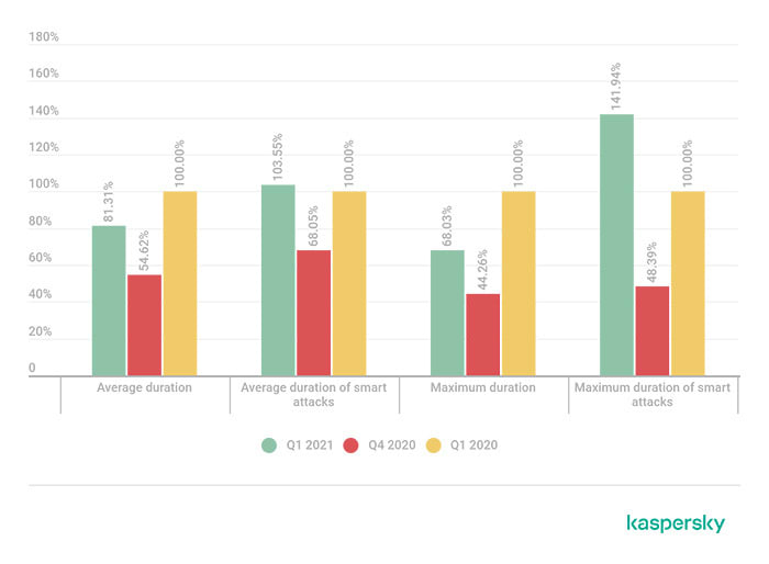 As the data above shows, the prevalence of DDoS smart attacks has increased in early 2021, when compared to Q4 of 2020. The average duration of these attacks has become longer than the same stage last year, and the overviews provided by enterprise architecture can significantly help businesses spot holes in their framework and move decisively towards achieving their security goals. DDoS attacks cost small businesses around $123,000 and large enterprises approximately $2.3 million respectively last year alone.