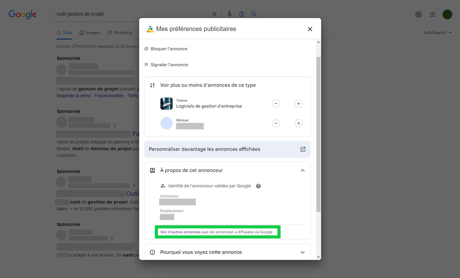 Autre méthode pour accéder aux publicités : lorsque vous voyez une annonce dans la SERP, vous pouvez cliquer sur l’icône sous forme de trois points située à côté de l’url, puis choisir Voir d’autres annonces que cet annonceur a diffusées via Google. Vous serez alors redirigé vers l’Ads Transparency Center.