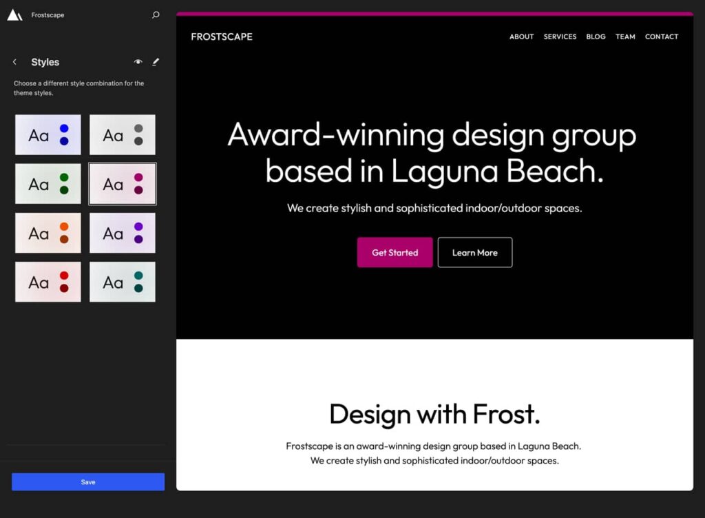 The Frost Blueprint includes a wide range of pre-built blocks and patterns including the Team Member and Text and Image patterns, and its many style variations provide a fashionable foundation for any new project. This allows users to truly harness the power and extensibility of the Full Site Editing experience.