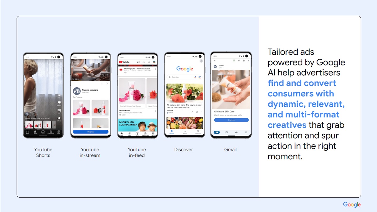 Alors que les campagnes Discovery se limitaient aux images, carrousels et flux de données produits pour les annonces, Demand Gen permet d’intégrer des vidéos (y compris YouTube et Shorts) et de mixer ces différents éléments. En proposant une grande variété de formats, les annonceurs peuvent espérer un taux de clics trois fois plus élevé par rapport aux campagnes sociales payantes, avec un coût par action réduit de 61 %, promet Google.