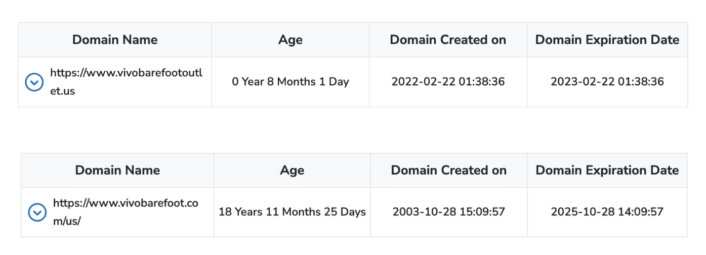 Going back to the Vivobarefoot example, a quick search of the legitimate company domain reveals it was created over 18 years ago, which makes sense considering it’s an established brand. Conversely, the alleged copycat site was only created eight months prior to our search.