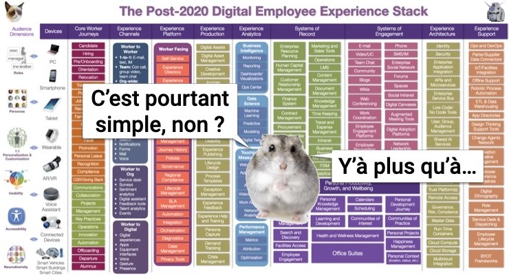 La situation est vraiment critique, car les conditions de marché imposent une réactivité et une souplesse maximale, ce que des outils conçus il y a 40 ans sont incapables de proposer. Je suis fermement convaincu qu’il est illusoire d’espérer travailler plus vite avec des outils informatiques et des habitudes du XXe siècle. Il est éventuellement possible de travailler plus longtemps, mais pour travailler mieux, il faut tout revoir. Cette situation est d’autant plus critique qu’il y a une prolifération alarmante des logiciels en ligne censés résoudre les problèmes cités plus haut, mais qui ne font qu’empirer les choses et multiplient les risques de faille de sécurité : Reimagining the Post-2020 Employee Experience.