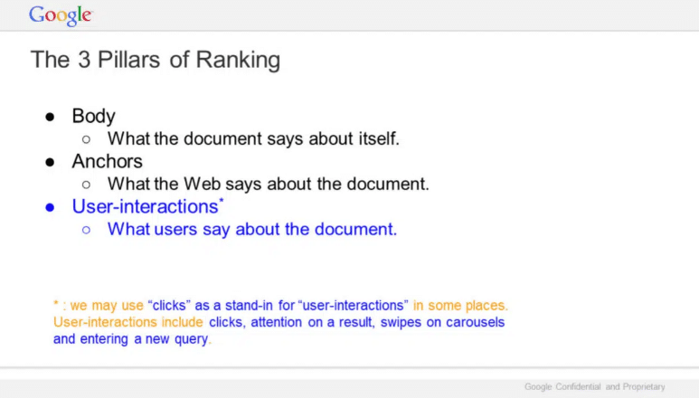 Google précise que les clics peuvent être utilisés comme substitut aux interactions des utilisateurs. Dans leur globalité, les interactions incluent les clics, l’attention portée à un résultat, les clics sur un carrousel, le survol de la souris, le scroll et la saisie d’une nouvelle requête.