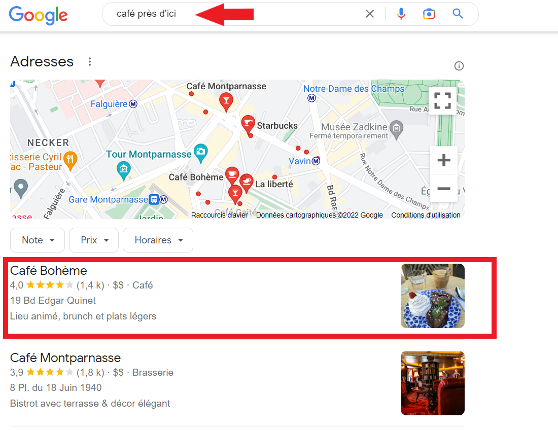 exemple de résultat de recherche locale sur Google pour la requête "café près d'ici"