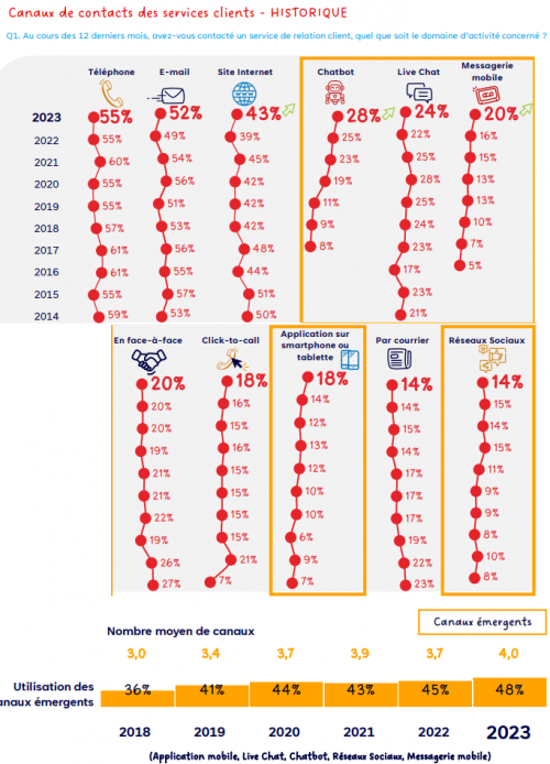 On peut aussi noter que qu’en 5 ans, les Français se sont appropriés ces nouveaux canaux de communication, en passant de 3 canaux à 4 canaux pour contacter un service client.