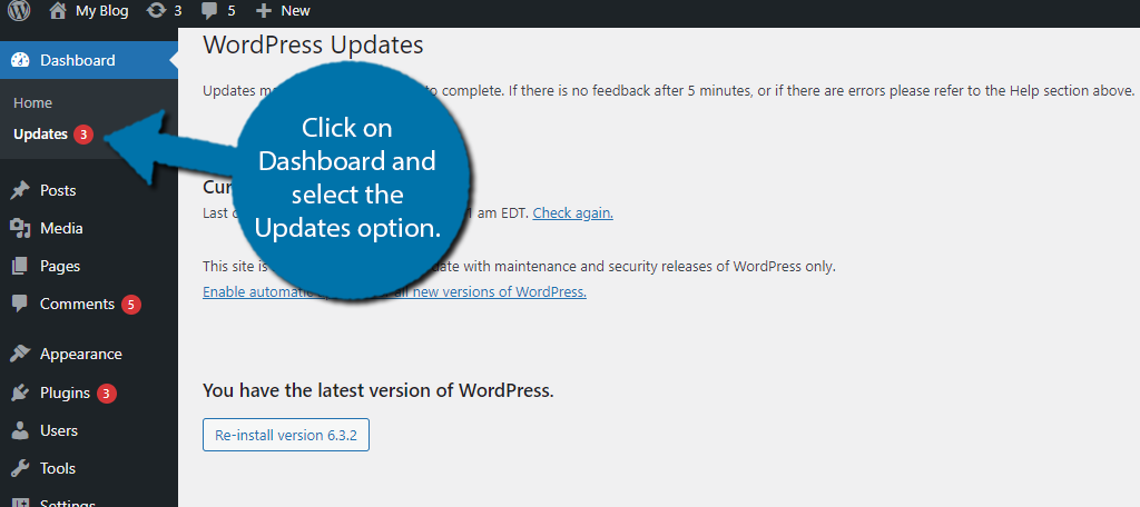 To view if there are updates available, log into your WordPress site. On the left-hand admin panel, click on Dashboard and select the Updates option.