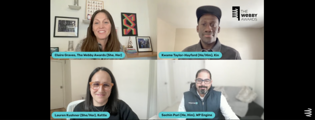 The discussion was moderated by Claire Graves, President of The Webby Awards, and panel members included Kwame Taylor-Hayford, Co-founder of KIN, and Lauren Kushner, CEO at Kettle.