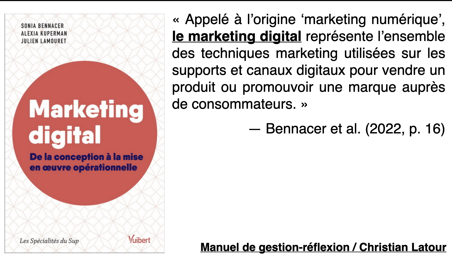 « Le marketing digital désigne l’ensemble des techniques marketing utilisées sur les supports et canaux digitaux pour vendre un produit ou promouvoir une marque auprès de consommateurs. Il regroupe également les applications, les méthodes et les outils déployés sur les tablettes, les mobiles, les jeux et objets connectés. » — Bennacer et al. (2022, p. 27)