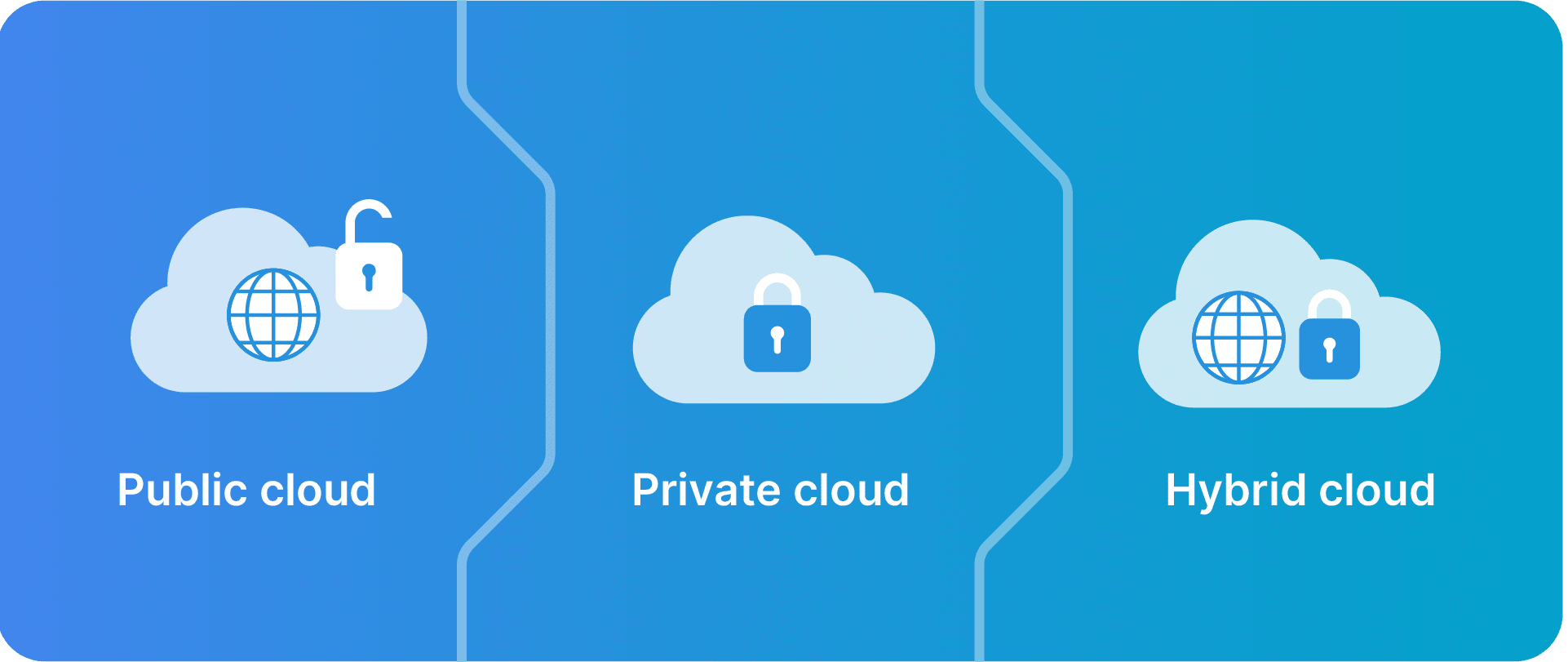 Public vs private vs. hybrid clouds.