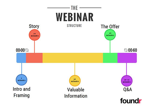 The first step to creating your webinar presentation is crafting the framework to build the presentation on. This is a common structure that is used for an hour-long webinar.
