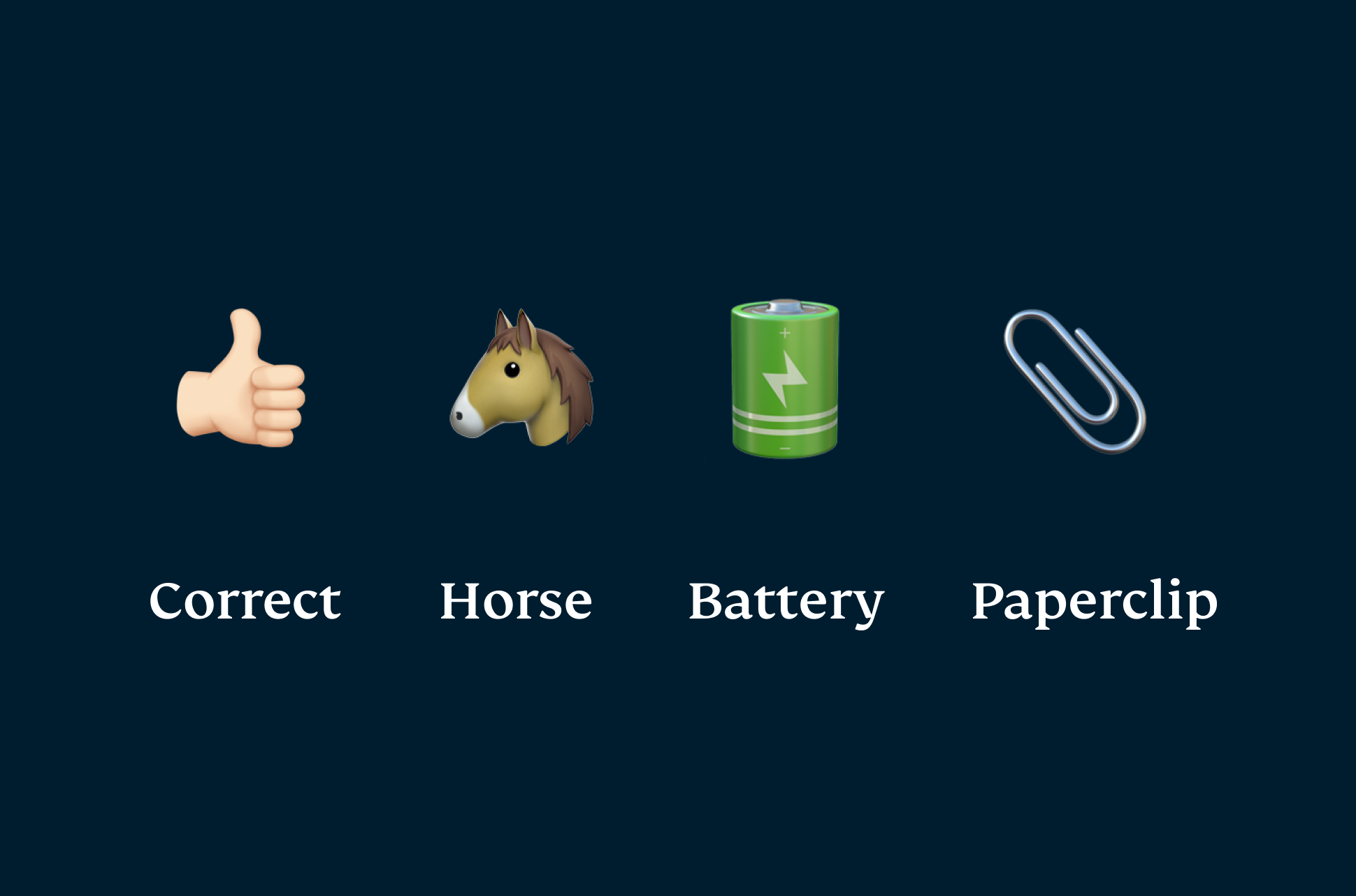 Example: correct horse battery staple. This is an often-seen example of a passphrase that uses four unrelated, seemingly random words.