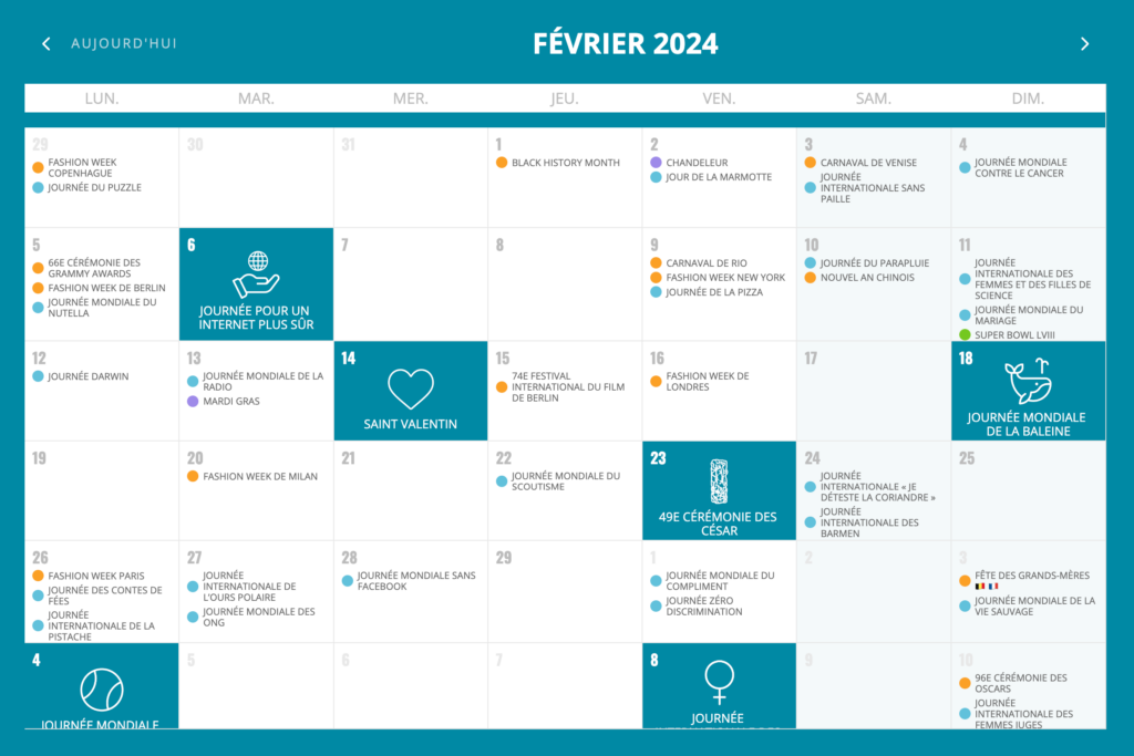Pratique et très visuel, ce calendrier classe les événements par type : événement, fêtes, journées internationales, jours fériés, sport… Vous pouvez ainsi rapidement accéder à toutes les infos clés pour bien communiquer.