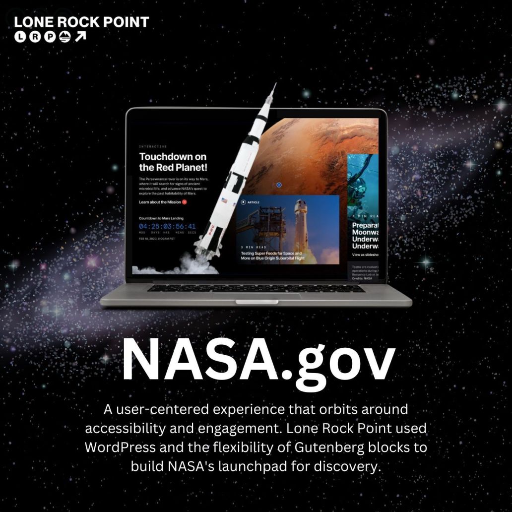 • Image: Laptop in space showing a rocket taking off. Description: NASA.gov. A user-centered experience that orbits around accessibility and engagement. Lone Rock Point used WordPress and the flexibility of Gutenberg blocks to build NASA’s launchpad for discovery.