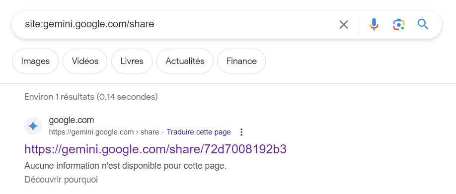 C’est l’action des utilisateurs, via un lien situé au bas de chaque chat, qui génère ces pages partageables. La première hypothèse a été de penser à un oubli de Google de placer un fichier robots.txt dans le sous-domaine de Gemini, permettant ainsi leur crawl et indexation.