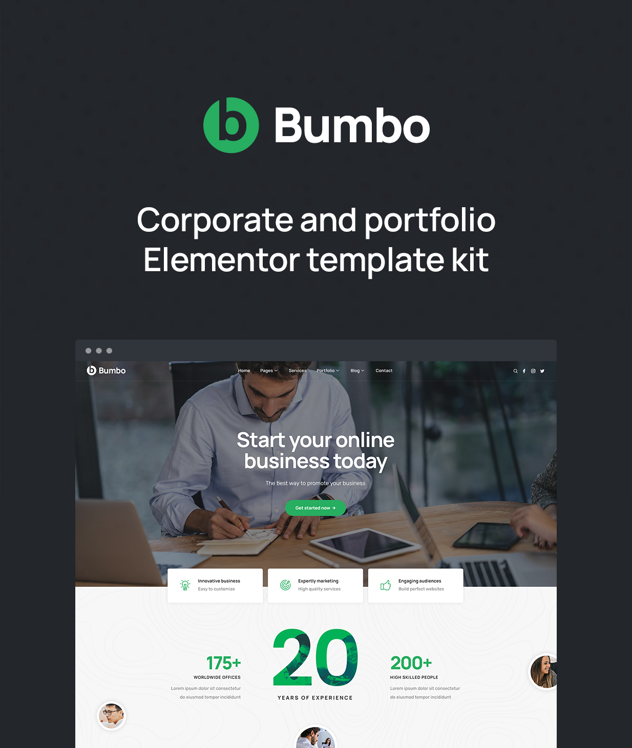 Build your responsive and modern design business, portfolio and blog website quickly with Bumbo Elementor template kit.