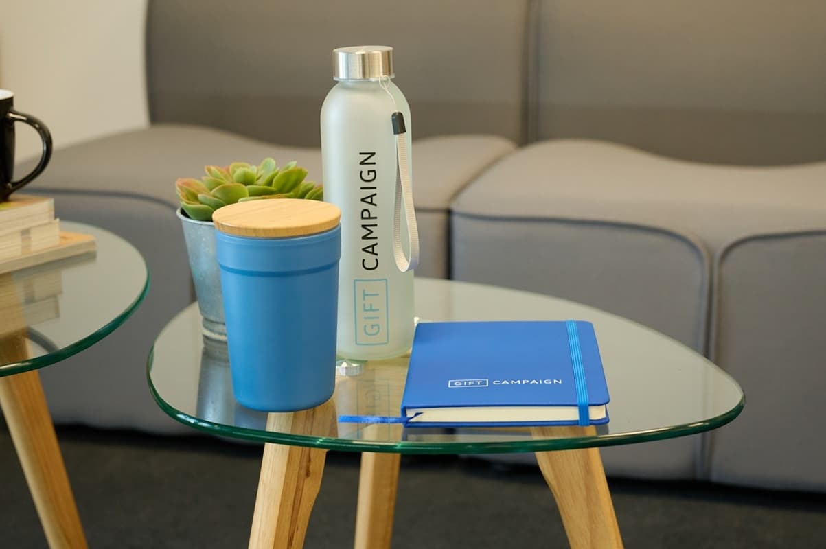 des goodies d'entreprise Gift Campaign sur une table basse