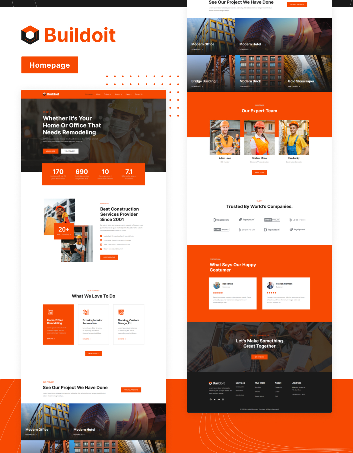 Buildoit is a fully-featured Elementor Template Kit dedicated to construction, real estate, building architecture, industrial, manufacturing, mechanical, etc.