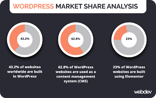 According to W3 Techs 43.2% of websites worldwide are powered by WordPress, with 62.8% using WordPress as their content management system (CMS). Of those WordPress websites, 23% utilize Elementor.