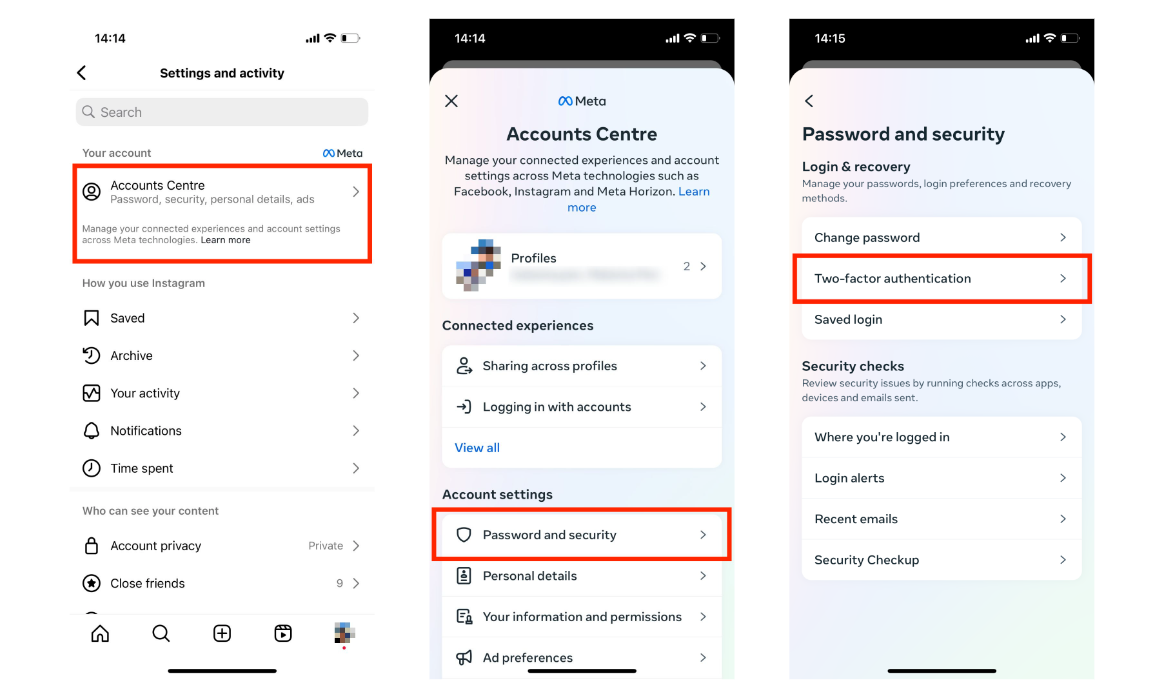 • Enable two-factor authentication (2FA): Doing this minimizes your risks in the event that someone does successfully phish you for account information. It adds an extra layer of security by requiring a second form of verification beyond just the password.Enable 2FA on your Instagram app from the settings menu: Tap your profile picture in the bottom right corner > three horizontal lines > Accounts Centre/Security > Passwords and security > Two-factor authentication > Choose Instagram (if you also have other accounts like Facebook) > Choose your method for 2FA (such as authentication app, SMS text or WhatsApp).