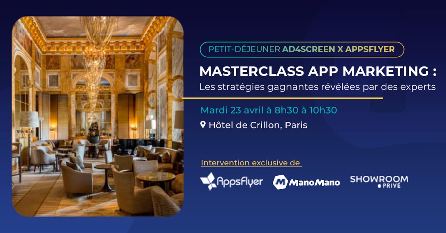 Mais les applications sont de plus en plus nombreuses sur les stores. Pour ne pas que la vôtre soit noyée parmi les autres, il faut travailler votre stratégie App Marketing. Ad4Screen fait office de référence dans le domaine de l’App Marketing. Pour aborder ce sujet en profondeur, l’agence organise une table ronde le 23 avril 2024 de 8h30 à 10h30. Rendez-vous en présentiel pour cette masterclass à l’Hôtel de Crillon, dans le 8e arrondissement de Paris.