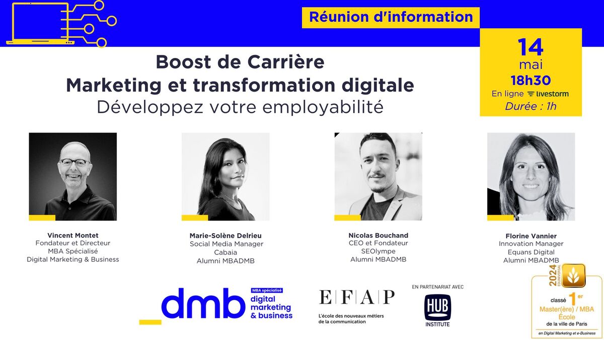 Alors que nous évoluons dans un environnement de plus en de plus imprévisible, marqué par la volatilité, l’incertitude, la complexité et l’ambiguïté (concept VUCA), les futurs professionnels du digital doivent s’adapter pour accompagner les marques à se réinventer. Des compétences en marketing et communication digitale sont devenues indispensables pour faire carrière dans ce domaine et vous démarquer de la concurrence. Pour vous aider dans votre démarche, le MBA Spécialisé Digital Marketing & Business (MBADMB) de l’EFAP, n°1 du classement Eduniversal des meilleurs mastères à Paris, organise sa prochaine réunion d’information en ligne, le mardi 14 mai à 18h30. L’objectif : vous apporter toutes les clés pour réussir votre projet professionnel et booster votre employabilité.