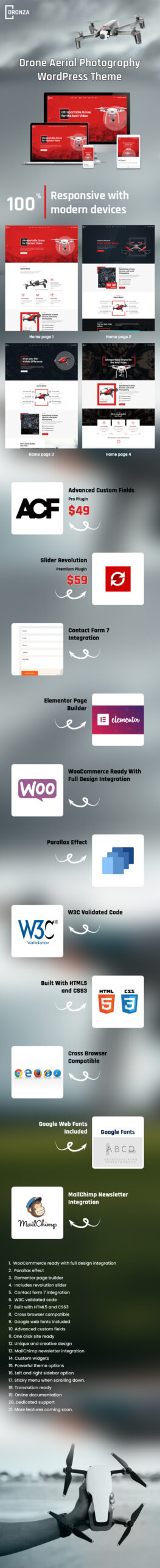 Dronza – Drone Aerial Photography WordPress Theme is a perfect solution for creating any kind of Drone, photography, woocommerce, blog, creative, gallery, media, video production websites that needs a feature rich and beautiful presence online with flexible design. This is a perfect theme for leaving a positive impression to your customers