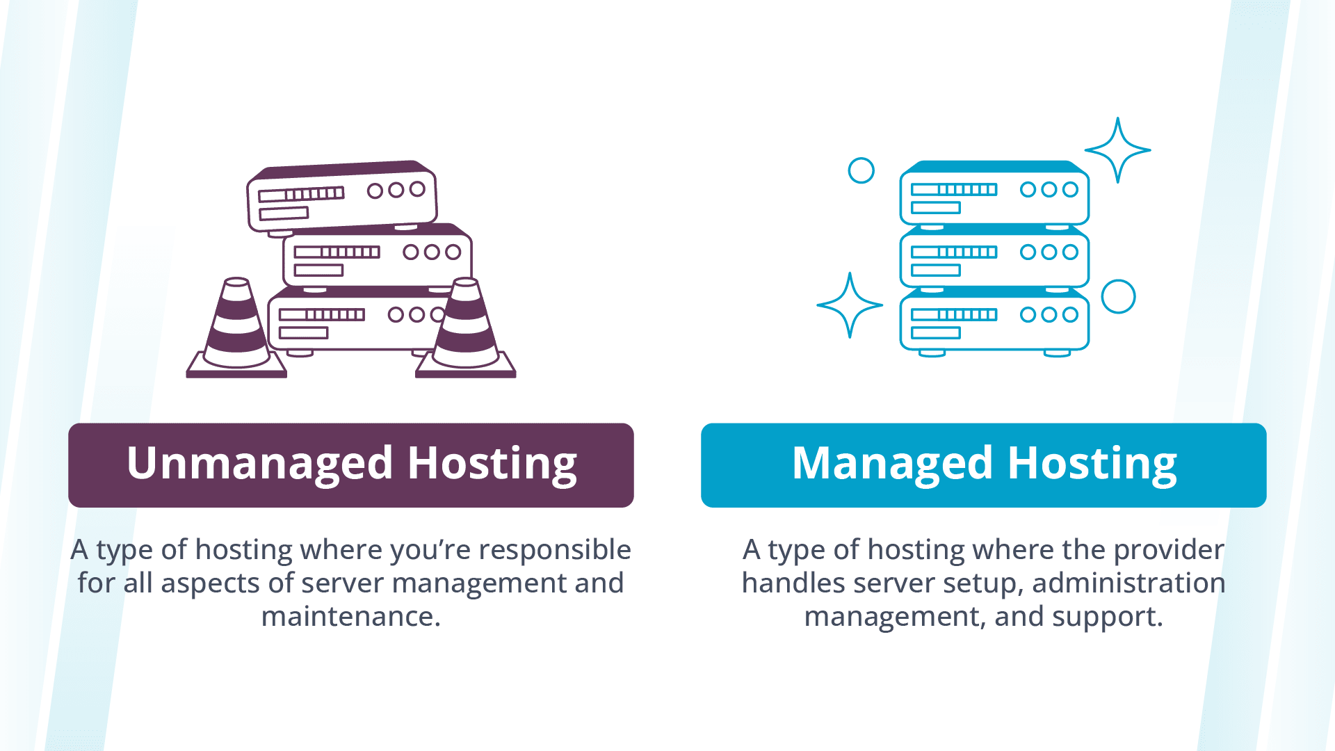 Web hosting can be broadly categorized into two types: unmanaged and managed.