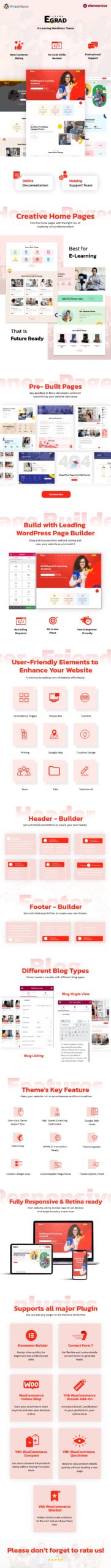Egrad is professionally designed to be fully responsive and customizable without coding. It includes multiple pre-built home page demos that are fully customizable with easy drag-and-drop functionality. This online learning management theme is neatly documented and has excellent professional support to answer your queries. Egrad theme also has multiple readymade inner pages that you can simply start customizing and make unique for your site. Get unlimited possibilities with header and footer builders. It supports all the essential plugins like Elementor, Contact form 7, Woocommerce, and Yith Woocommerce plugins.