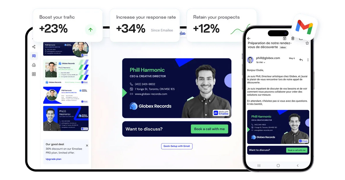 Emailee est un outil en ligne qui permet de créer des signatures mail personnalisées. La solution s’adresse aux professionnels qui cherchent à augmenter leur taux de conversion, en donnant de la visibilité à des liens spécifiques (blog, page de vente, newsletter, services…) dans des bannières marketing.